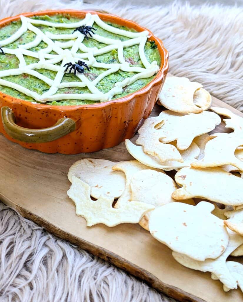 shot of assembled Halloween Guacamole with Spooky Chips on a wooden board
