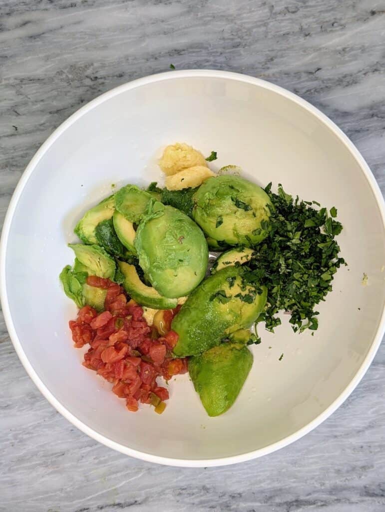1. Cut the avocados in half and remove the pit. Scoop out the avocados into a large bowl. Add the lime juice, salt, Rotel, minced garlic, cilantro and the salt.