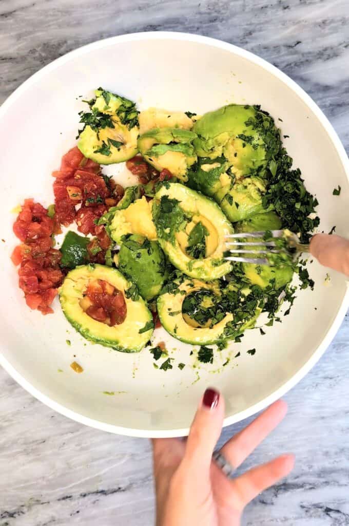 2. Mash the avocados in the mixture using the back of a fork until you achieve the desired consistency.