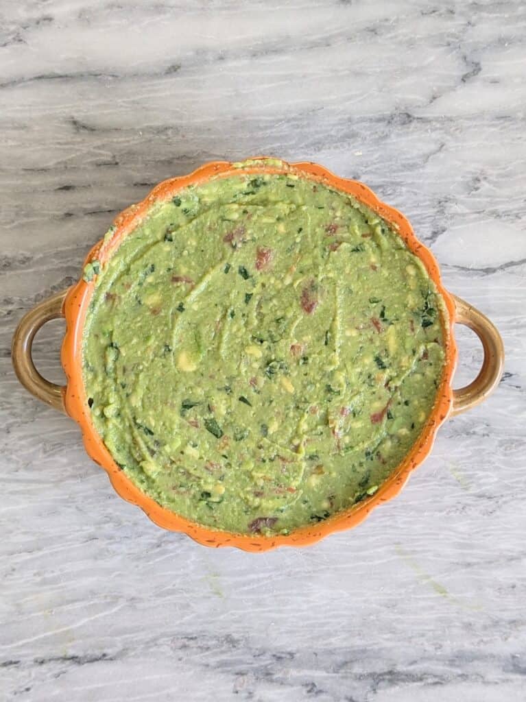 4. Spoon the guacamole dip into a serving bowl and smooth the surface of the guacamole with your spatula.