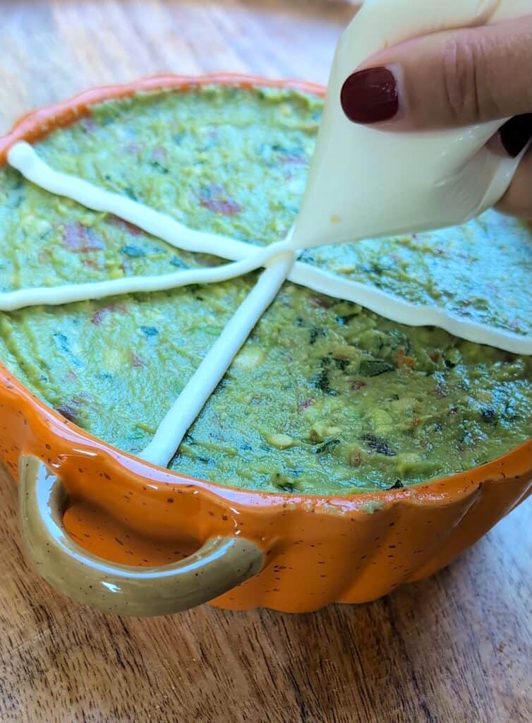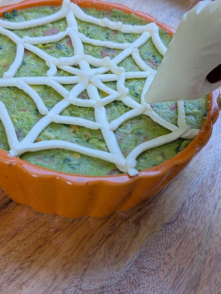 5. Place your sour cream in a ziploc bag (or piping bag), cut a small hole in one of the corners and pipe your spiderweb on top of the dip. (Start by making a cross, then two lines creating an X shape. Connect the straight lines with three swooping lines in each section.)